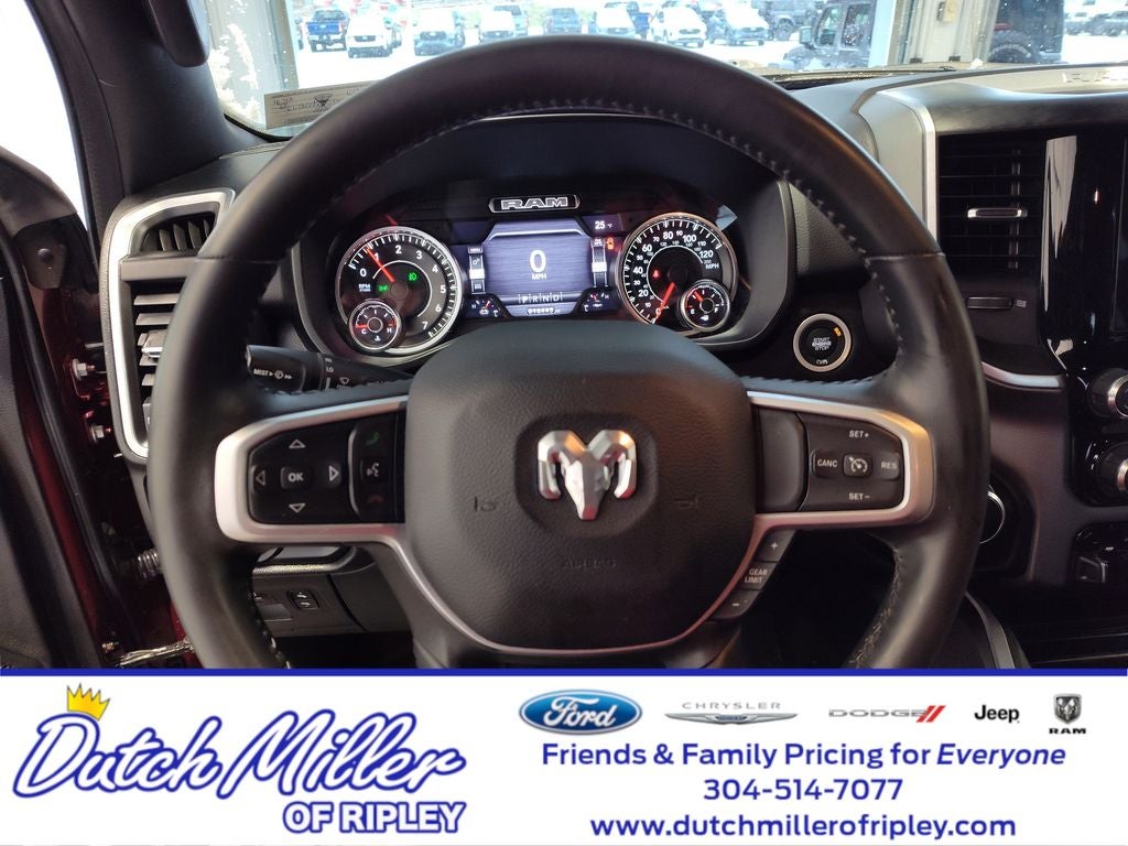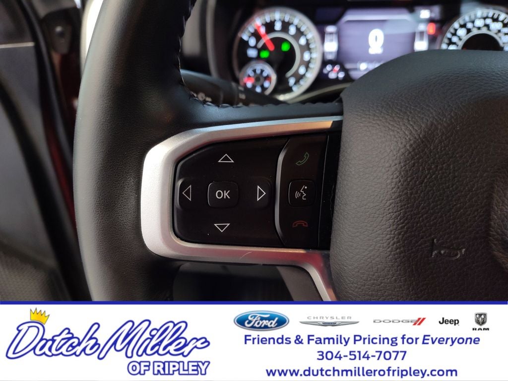 Quick Order Package 27Z Big Horn: Big Horn Badge. Big Horn Level 2 Equipment Group: Google Android Auto; SiriusXM Radio Service; Bluetooth® Handsfree Phone and Audio; USB Host Flip; Rear Window Defroster; For Details. Visit DriveUconnect.com; Integrated Center Stack Radio; ParkSense Front/rear Park Assist with Stop; Rear View Auto Dim Mirror; Power Adjustable Pedals; Rear Power Sliding Window; Rear Dome with On/off Switch Lamp; Connectivity - US/Canada; Glove Box Lamp; 4G LTE Wi-Fi Hot Spot; 115V Auxiliary Rear Power Outlet; GPS Antenna Input; Media Hub with 2 Charge Only USBs; Exterior Mirrors with Heating Element; Power 8-Way Driver Seat; Auto Dim Exterior Driver Mirror; Global Telematics Box Module; Heated Front Seats; Heated Steering Wheel; 8.4" Touchscreen Display; Black Exterior Mirrors; Class IV Receiver Hitch; Security Alarm; Black Premium Power Mirrors; Apple CarPlay; Big Horn Instrument Panel Badge; Remote Start System; SiriusXM Satellite Radio; Exterior Mirrors with Supplemental Signals; Exterior Mirrors Courtesy Lamps; Air Conditioning ATC with Dual Zone Control; 115V Auxiliary Power Outlet; Cluster 7.0" TFT Color Display; Universal Garage Door Opener; Power-Folding Mirrors; 2nd Row in Floor Storage Bins; Convex Wide-Angle Mirror Insert; Sun Visors with Illuminated Vanity Mirrors; Power 2-Way Driver Lumbar Adjust. Level 1 Safety Group: Advanced Brake Assist; Cluster 3.5" TFT Color Display; Rear View Auto Dim Mirror; Pedestrian Emergency Braking; Full Speed Forward Collision Warning Plus; Lane Keep Assist. Premium Lighting Group: Front LED Fog Lamps; LED Reflector Headlamps; LED Taillamps. Quick Order Package 23Z Big Horn: Big Horn Badge. 20" X 9" Aluminum Chrome Clad Wheels. Wheel to Wheel Side Steps. Uconnect 5 Navigation Radio with 8.4" Display. 9 Amplified Speakers with Subwoofer. Deluxe Cloth Bucket Seats. Anti-Spin Differential Rear Axle. ParkSense Front/rear Park Assist with Stop. Trailer Brake Control. 115V Auxiliary Power Outlet. Remote Start System. Rear Wheelhouse Liners. Delmonico Red Pearlcoat. Delmonico Red Pearlcoat. MOPAR Front and Rear Rubber Floor Mats. Cluster 7.0" TFT Color Display. **Equipment listed is based on original vehicle build and subject to change. Please confirm the accuracy of the included equipment by calling the dealer prior to purchase.**