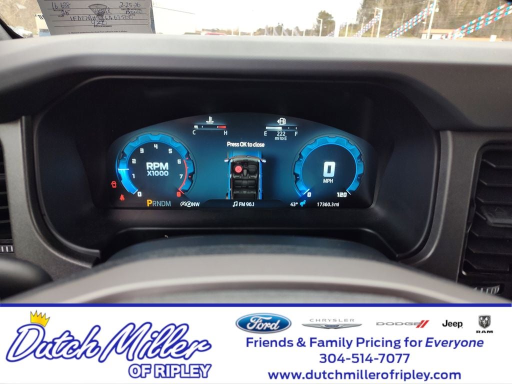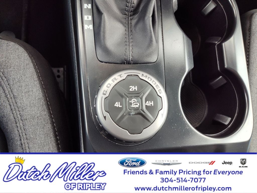 Equipment Group 222A Mid Package: 17" Carbonized Gray-Painted Aluminum Wheel; Rear Parking Sensors; Power Outlet - Back Side of Center Floor Console; Dual Smart Charging USB Ports; 2.3L EcoBoost I-4 Engine; Front Row Heated Seats; Driver and Front Passenger Illuminated Sliding Visor Vanity Mirrors; AM/FM Stereo; Dual-Zone Electronic Automatic Temperature Control; Connected Navigation; P255/75R17 A/T Tires; Ambient Footwell Lighting; Remote Start System; Cloth Bucket Seats; 2-Door Intelligent Access with Lock/unlock. Ford Co-Pilot360: Auto High-Beam Headlamps; Rear View Camera; Pre-Collision Assist with Automatic Emergency Braking; Blind Spot Information System (BLIS); Lane-Keeping System. Carbonized Gray Molded-In-color Hard Top. **Equipment listed is based on original vehicle build and subject to change. Please confirm the accuracy of the included equipment by calling the dealer prior to purchase.**